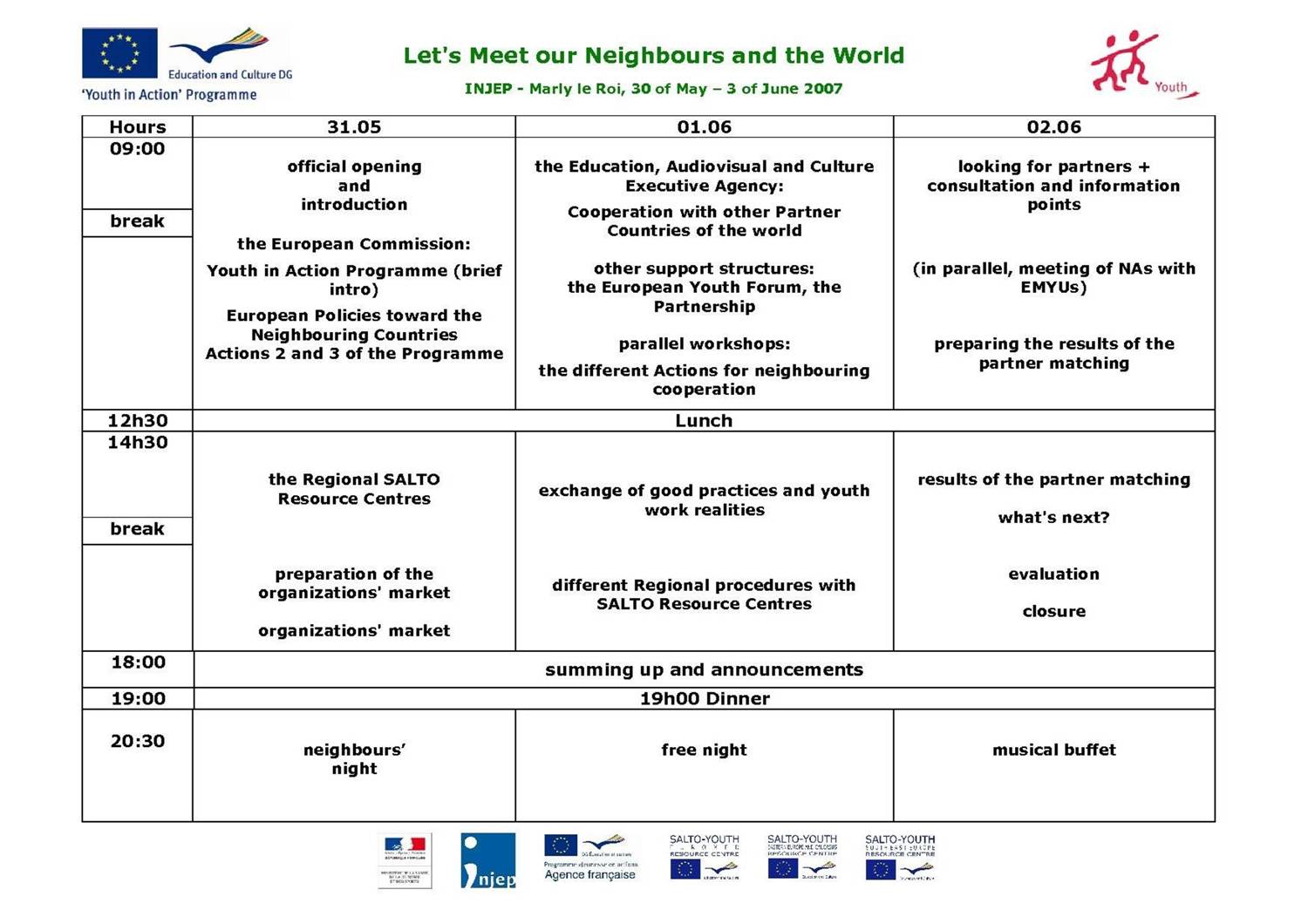 Having a seminar, where representatives from all the regions: Programme Countries, EuroMed, South East Europe as well as Eastern Europe and Caucasus, could meet, create contacts and value the importance of wide international youth cooperation was our dream and also a very concrete aim for the beginning of 2007. We: European Commission, SALTO Regional Resource Centres and French National Agency had a clear vision of organizing an event, where the political input will goes together with a very actual work on future Youth Exchanges, Trainings, Seminars and European Voluntary Service projects.