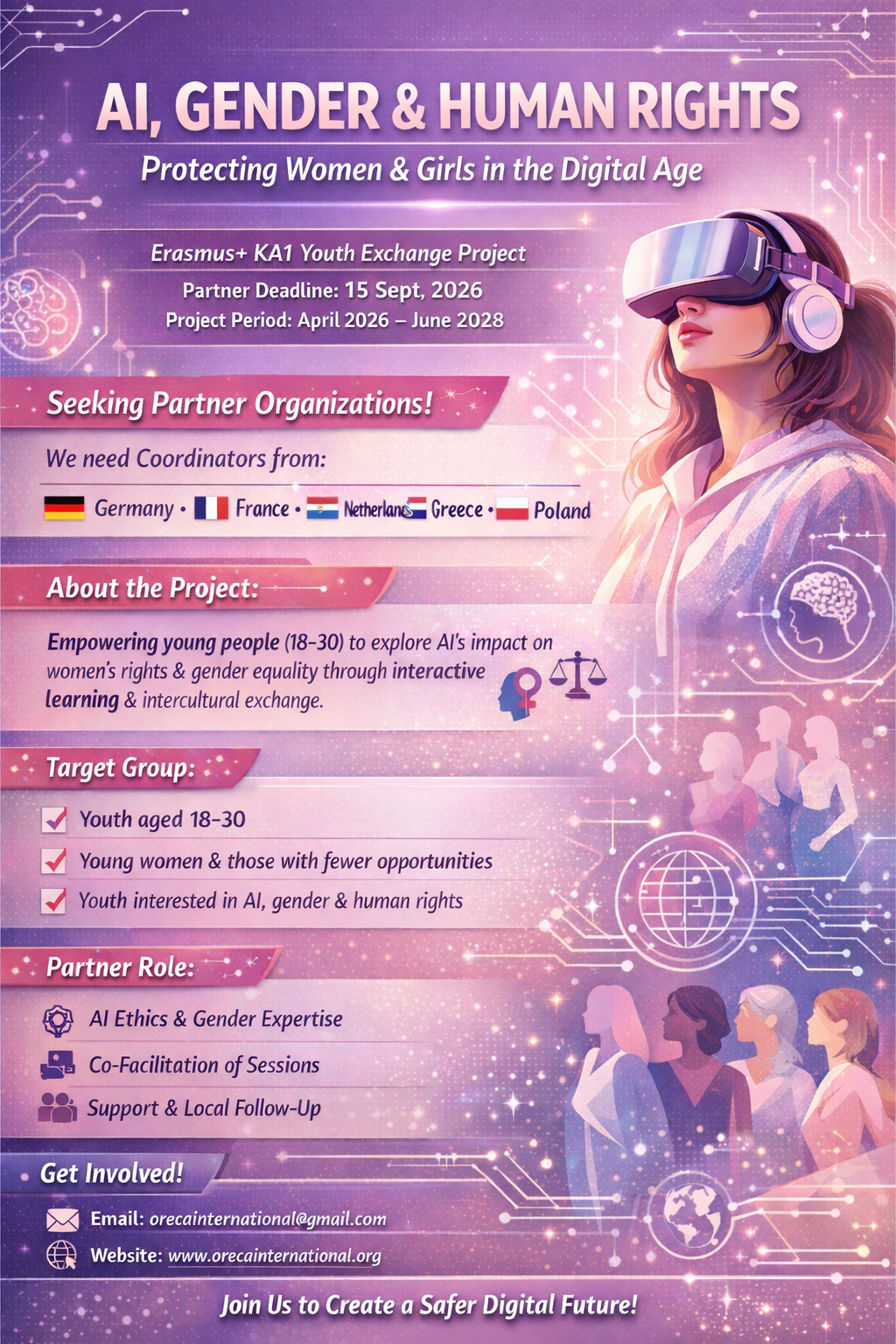 This project explores the intersection of Artificial Intelligence, gender, and human rights, aiming to protect women and girls in the digital age. Through a KA1 Youth Exchange, young people aged 18–30—including those with fewer opportunities—will engage in interactive workshops, discussions, and intercultural dialogue on digital rights, ethical AI, and gender equality. Partner organizations will contribute thematic expertise, co-facilitate sessions, and support local dissemination. The exchange fosters critical thinking, youth-led reflection, and advocacy skills, empowering participants to shape safe, inclusive, and gender-responsive digital futures.Indicative Activities: