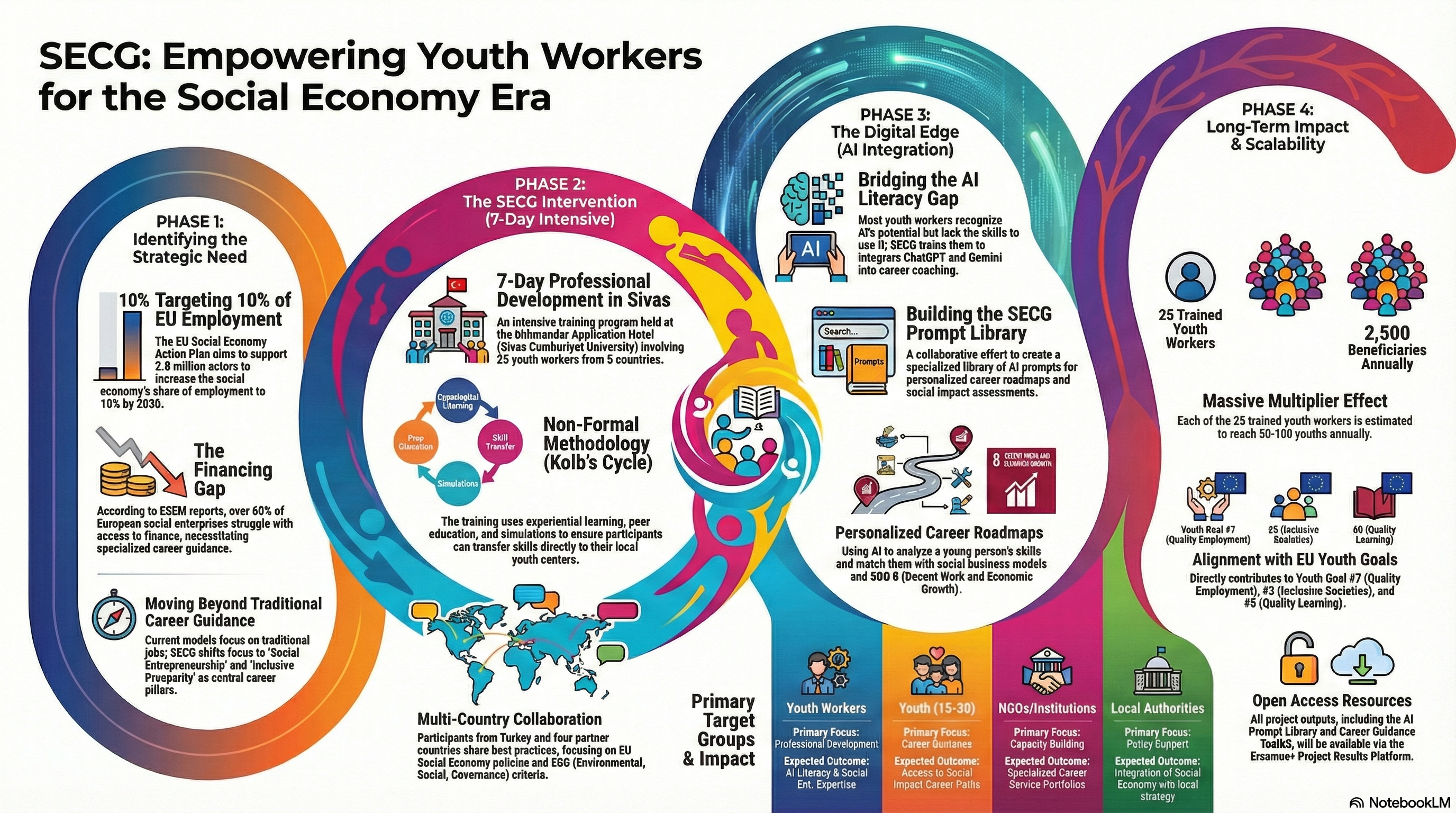 The "Social Entrepreneurship Career Guidance: Empowering Youth Workers as Catalysts for Change" (SECG) project is an international professional development initiative aimed at equipping youth workers with the skills to contribute to career guidance in the social entrepreneurship process. The project seeks to change the traditional understanding of career guidance, creating a profile of young workers who are not only employed but also allowed to pursue their potential as entrepreneurs creating social value. In this process, artificial intelligence tools are incorporated into career guidance, forming one of the elective elements.
