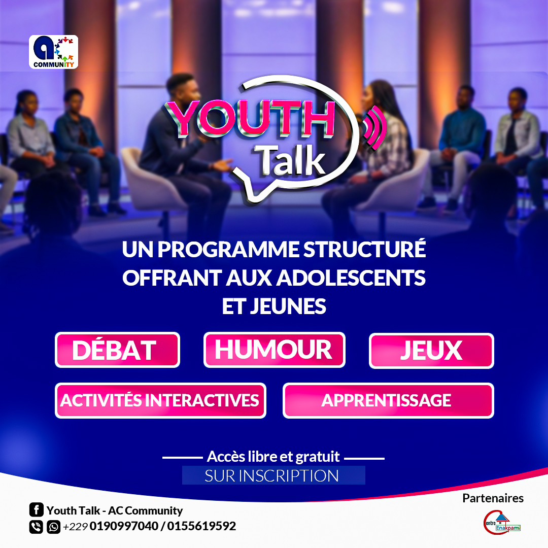 YOUTH TALK est un programme éducatif, participatif et communautaire porté par AC Community, conçu pour offrir aux jeunes et adolescents un espace sûr d’expression, de dialogue et d’apprentissage.