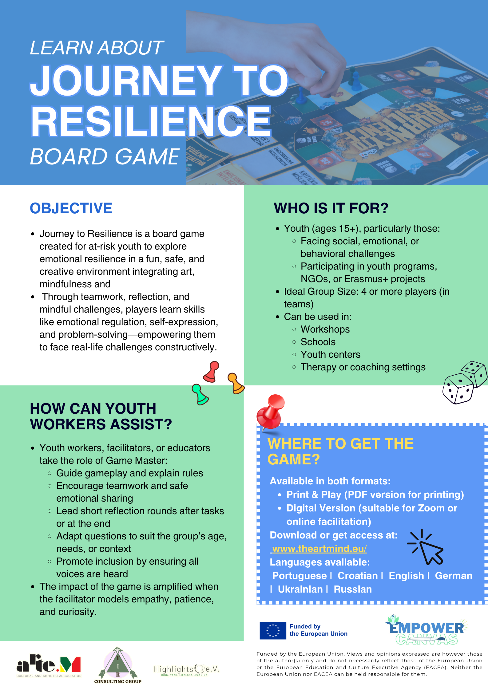 The main aim of the game is to help players (at-risk youth) develop resilience by actively engaging them in tasks that foster essential life skills such as leadership, emotional intelligence, critical thinking, interpersonal skills, art and mindfulness. Youth workers play a key role in facilitating the game and guiding the players through the activities and reflections.