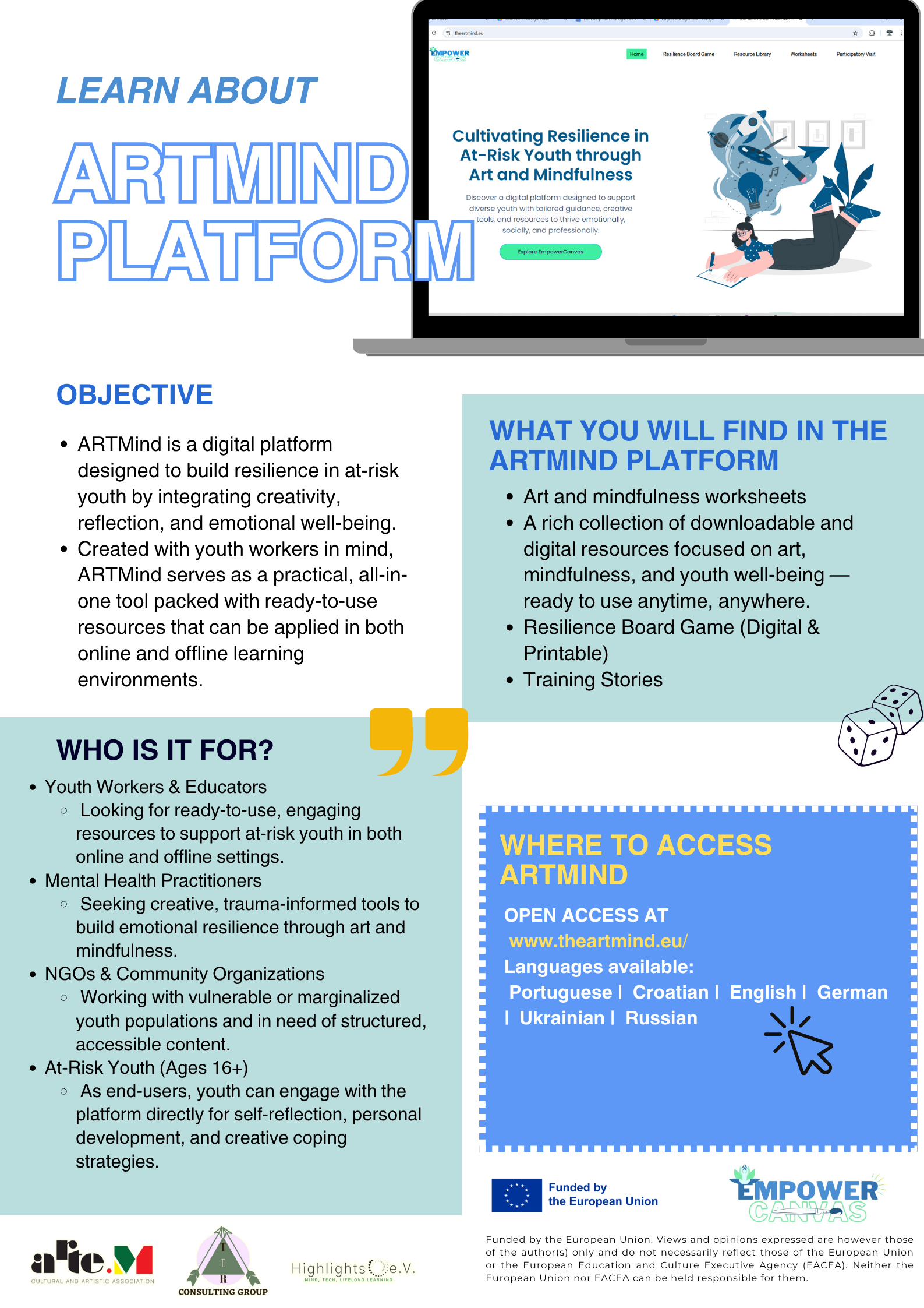 1. At-Risk Youth: The primary focus of the project is on at-risk youth who are facing socio-economic, cultural challenges & fewer opportunities. This includes young individuals who are experiencing unemployment, poverty, migration, refugee status, minority backgrounds, and discrimination. The project aims to provide them with support, resources, and opportunities to enhance their well-being, resilience, and enhance their employability possibilties. 2. Youth Workers and Educators: The project also targets youth workers and educators who play a crucial role in supporting at-risk youth. By providing training, tools, and resources, the project aims to empower youth workers and educators with the skills and knowledge needed to effectively utilize art-based activities and mindfulness practices for building resilience and promoting well-being among at-risk youth. 3. Youth Centers and Community Organizations: The project seeks to establish partnerships with youth centers and community organizations that serve at-risk youth
