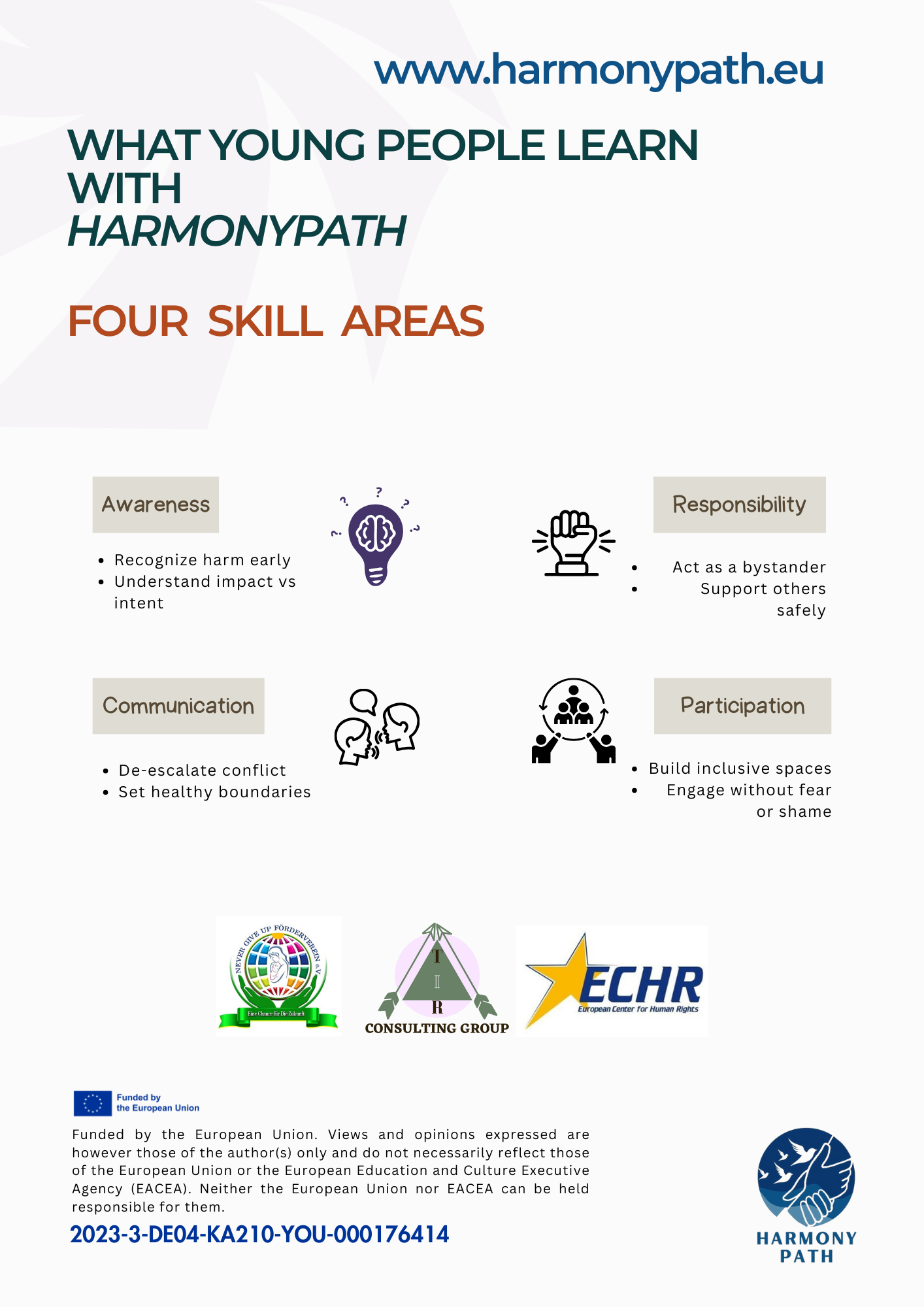 The aim of HarmonyPath is to support young people and youth workers in preventing violence and strengthening peacebuilding skills by: