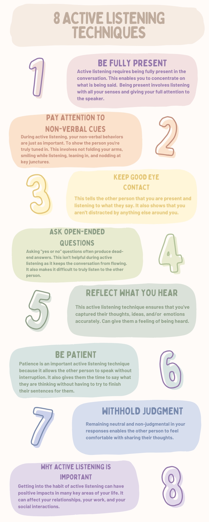 - Learning to listen without interrupting and showing genuine interest in what others have to say.